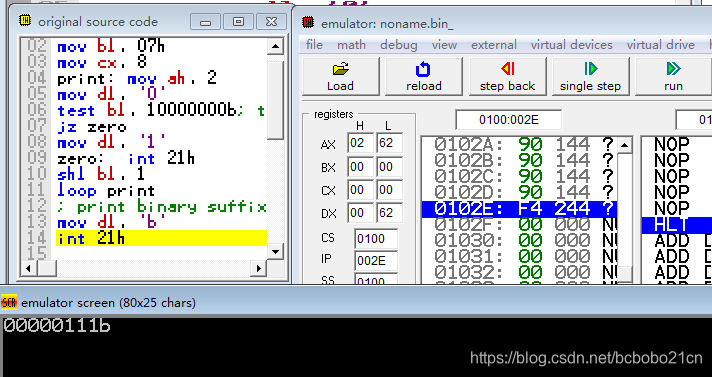 最后把字符'b'放入dl,输出此字符,二进制的结尾标志;